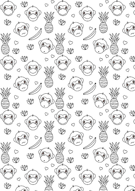 Today begins the Chinese Year of the monkey! That's why I created a free printable monkey coloring page for you.  Therefore I've drawn some cute monkey faces, pineapples, bananas, flowers, and hearts.